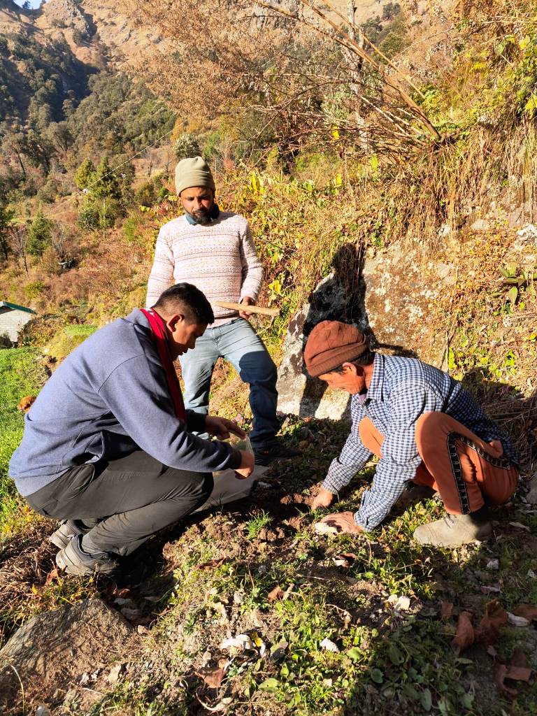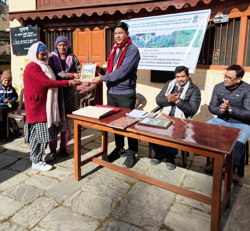 The Centre for Biodiversity Conservation and Management of G.B. Pant National Institute of Himalayan Environment, Almora organized a sensitization workshop from 3-9 December, 2025 in different valleys (Chaudas, Vyas, Darma) of Pithoragarh District, Uttarakhand. The programme was conducted under the Department of Biotechnology (DBT) funded project entitled “Promotion of High Value Medicinal Plants Cultivation, Post Harvest Management and Value Addition in the Indian Himalayan Region”. During the programme, a team of researchers and scientists provided agro-technique training on different key species like Saussurea costus (Kuth), Angelica glauca (Gandrayani), Picrorhiza kurroa (Kutki) and Hedychium spicatum (Van haldi), and also distributed seeds to the participating farmers. The participants were also sensitized towards conservation of biodiversity, qualitative production of medicinal plant, market demand, value chain dynamics, and voluntary certification scheme for medicinal plant produce. Furthermore, several villages across the three valleys were identified and selected for medicinal plant cultivation. A total of 35 local farmers actively participated in the program and expressed their willingness to support the institute initiative in future.