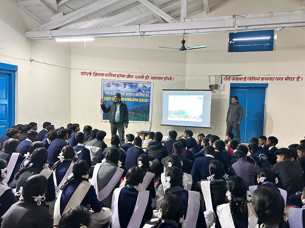 The EIACP Centre of the Govind Ballabh Pant National Institute of Himalayan Environment (GBPNIHE), Kosi–Katarmal, Almora, organised a workshop at Shaheed Mohan Singh Jeena Government Inter College, Sheetlakhet, under the 9th edition of Pariksha Pe Charcha. The programme focused on Mission LiFE and Green School Practices. The initiative highlighted the importance of reducing examination stress and promoting joyful learning among students. Participants were sensitised about adopting environmentally friendly lifestyles to minimise human impact on nature. An illustrated lecture on green school development emphasised energy conservation, water and waste management, tree plantation, rainwater harvesting, solar energy use and plastic-free school campuses. The programme concluded with portal registration and a formal vote of thanks. A total of 319 participants attended the event.
